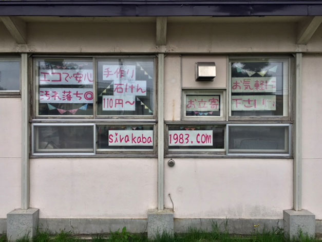 「春光3条6丁目」バス停前に窓広告を貼った当施設があります