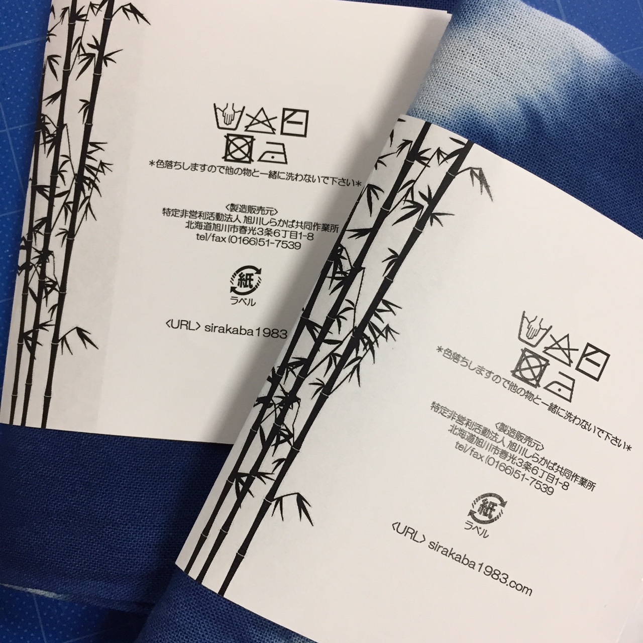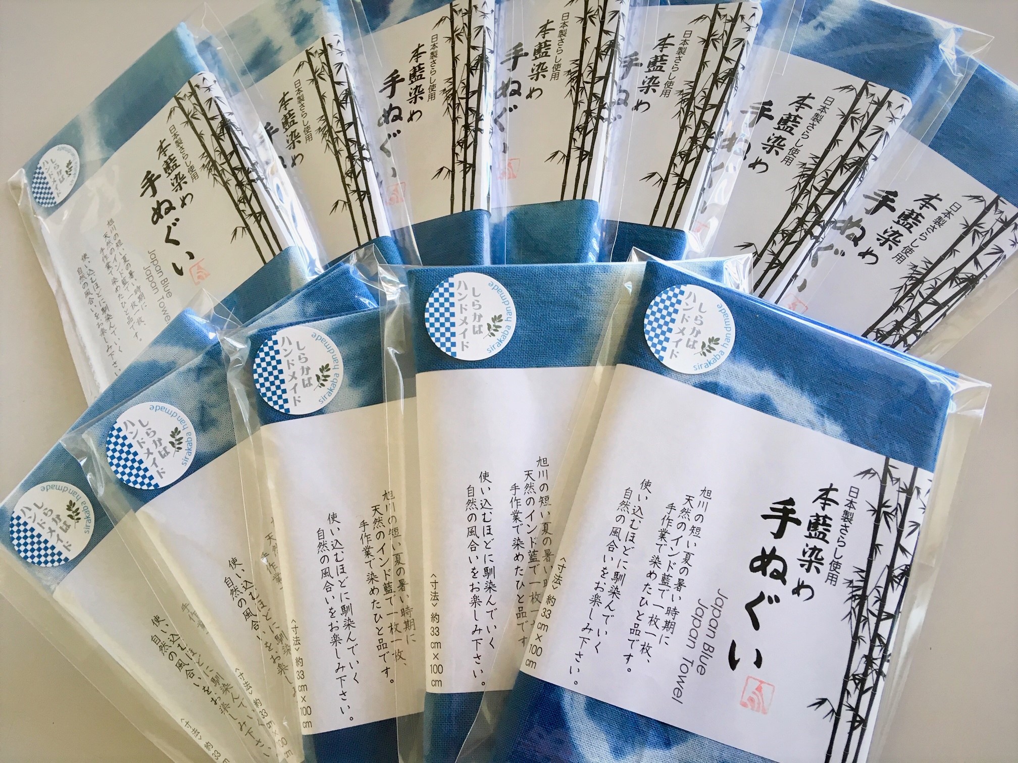 旭川の短い夏の暑い時期に藍を建てて染めたのち、色を定着させる為に一年間寝かせて商品化をしています。染め時間や模様の違いにより一点ものとして出来上がる藍の濃淡や柄、使い込むほどに馴染んでいく自然の風合いをお楽しみいただけます。