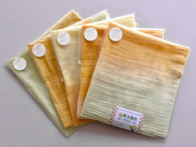 草木染めは旭川市内及び近郊の背高泡立ち草を使用したセイタカアワダチソウ染め、北海道産たまねぎを使用したタマネギ染めの2種類がございます。