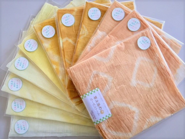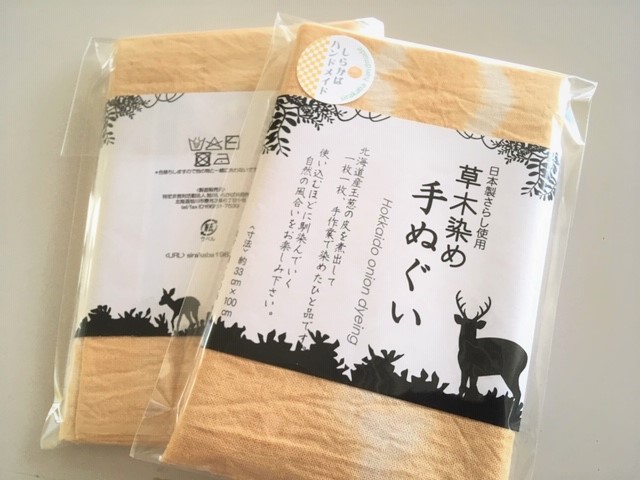 北海道産タマネギの皮やアボカドの種皮をじっくり煮出して、一枚一枚手作業で染めた一品です。