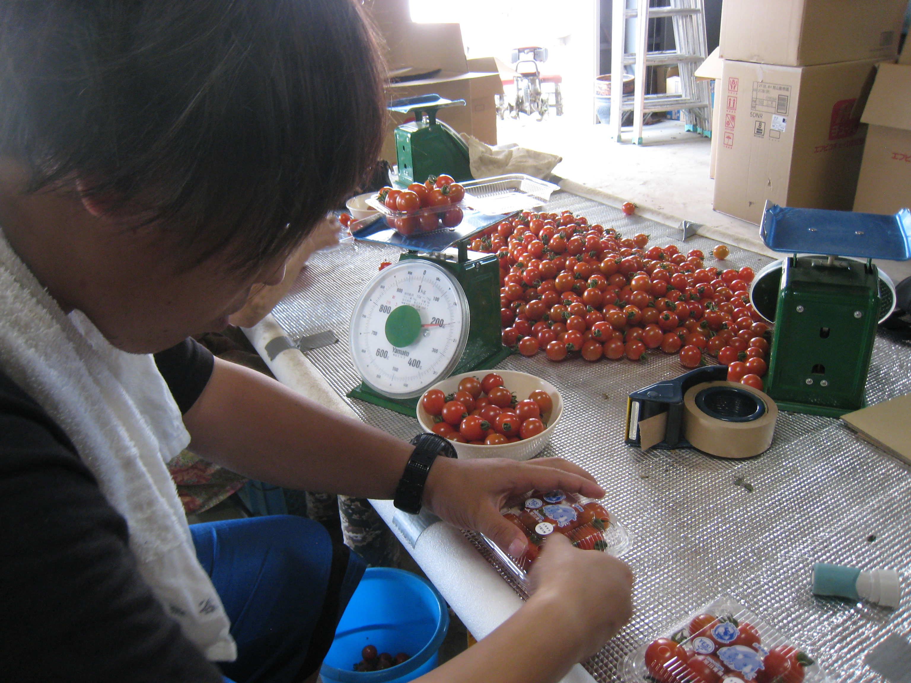 守屋農園さんで収穫されたトマトのパック詰め、段ボールの組み立て作業などを行なっています。