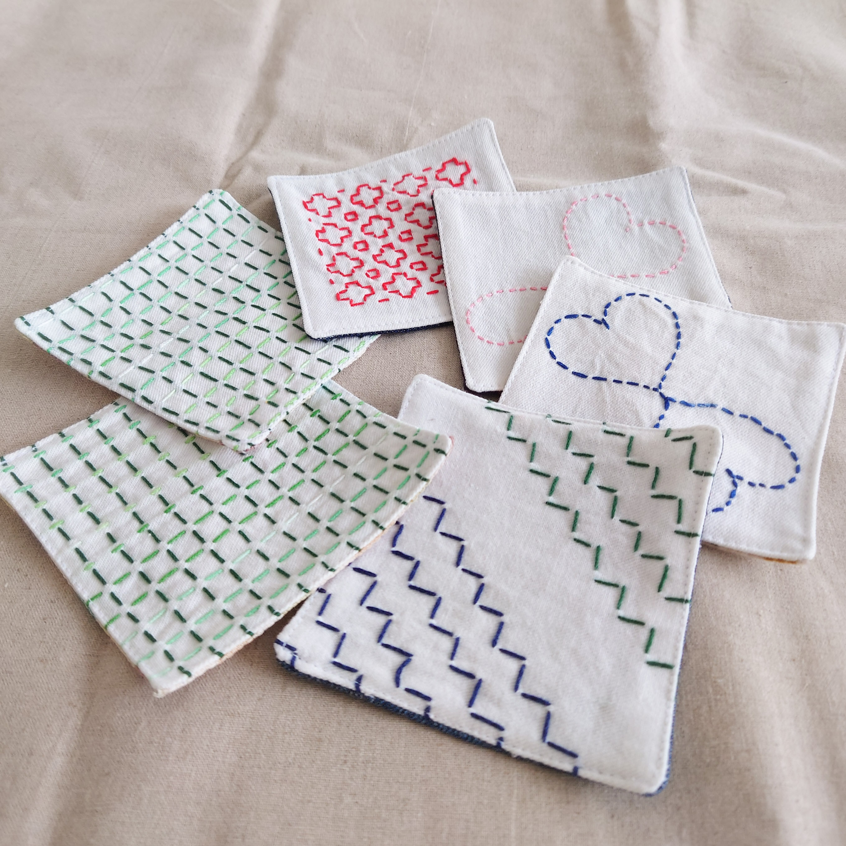 ひと針ひと針、楽しいひとときを過ごせるコースターになるように、