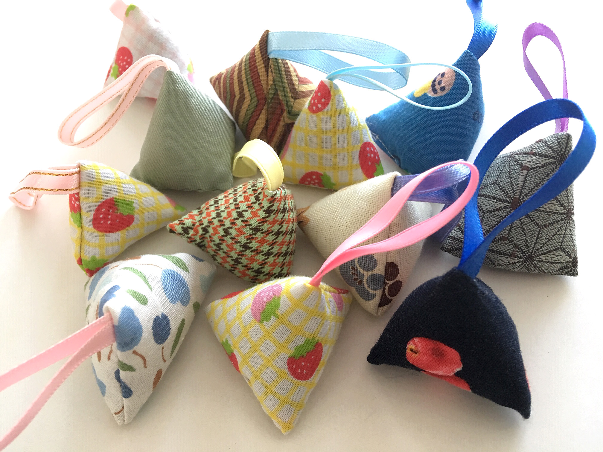 ラベンダーの花と茎を乾燥させ、細かく砕いて三角の入れ物に詰めヒモを付けました。